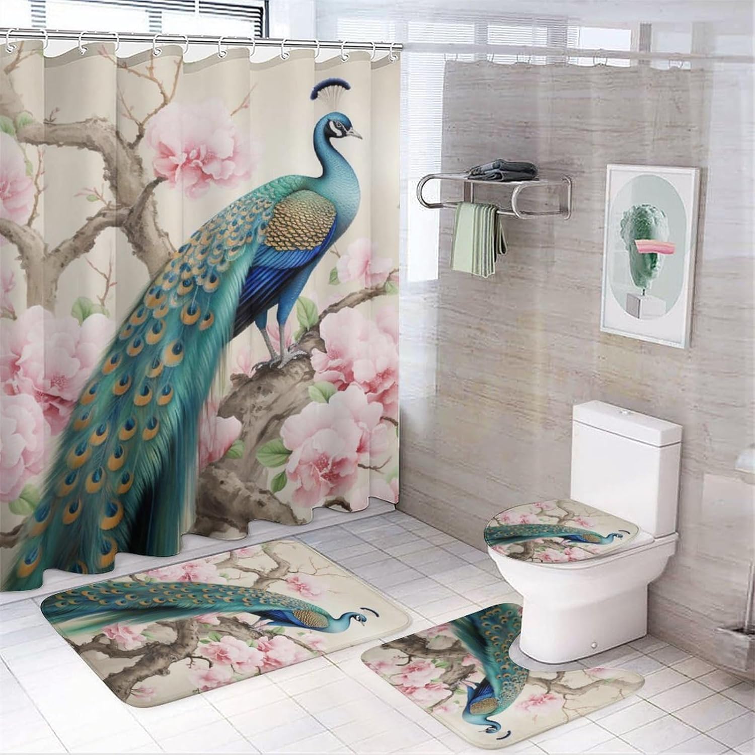 Accessories construction : Floor mat + U-shaped floor mat + Toilet seat cover cover + Shower curtain (with 12 C-shaped plastic hooks) Material: This four-piece set is made of coral velvet + waterproof oxford fabric, the fabric is soft and delicate, skin-friendly and comfortable, with a good sense of touch. coral velvet floor mats are super absorbent, non-slip.EASY TO CLEAN: It's very easy to clean and maintain, usually cleaning just need a hoover to absorb the dust, easy to store and easy to take care of on a daily basis. When not in use, gently roll it up and put it in the corner, it can be used for a long time.WATERPROOF: This shower curtain is made of waterproof Oxford cloth, waterproof performance is good, you can avoid water spraying to other places in the bathroom.Applicable Scenarios : Suitable for home bathroom, guest room, bedroom, living room and other places.Washing instructions: washable, not machine washable.After-sales Service:If you are not satisfied with our printed paintings, please feel free to contact us and we will answer you in the shortest possible time. Your satisfaction is our only pursuit.