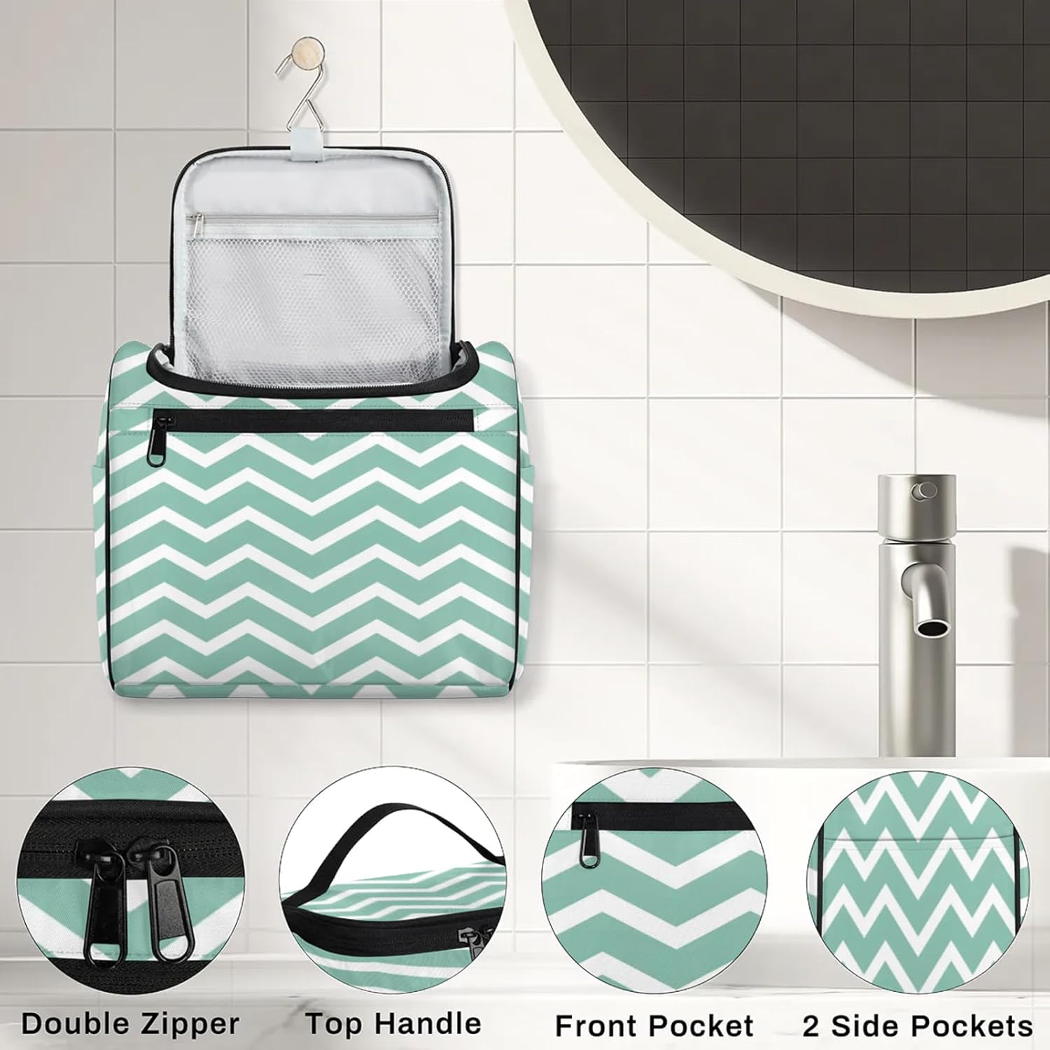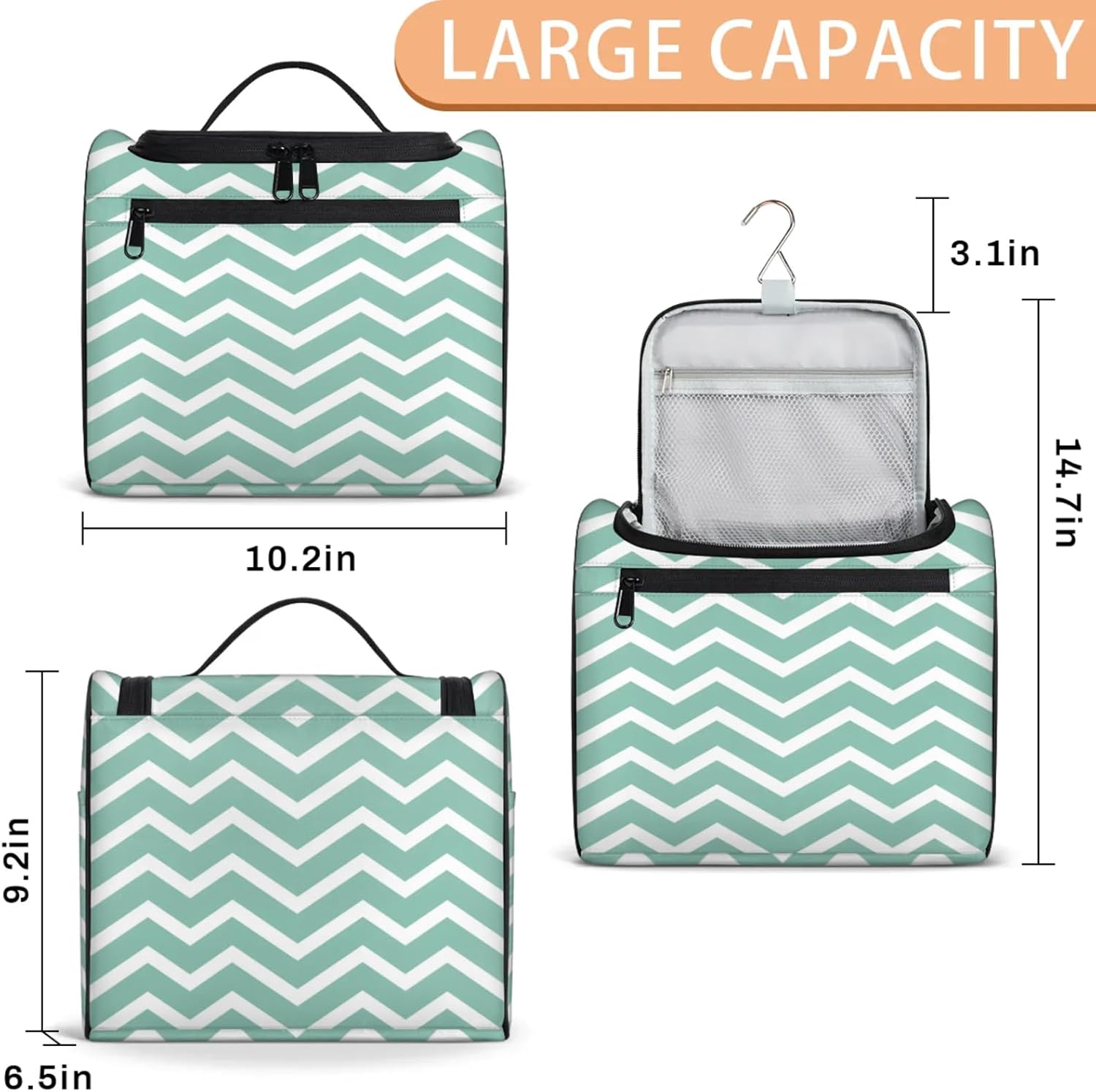 Product Description: Our Hanging Toiletry Bag is the perfect travel companion, whether you're on a business trip, a family vacation, camping, hitting the beach, or going to the gym. This bag is designed for convenience and organization. The durable, waterproof polyester fabric keeps your items dry and secure. The spacious main compartment is surrounded by eight small pockets, ideal for organizing makeup, toiletries, and more. Inside, you'll find a zippered mesh pocket and a robust metal hook. Hang it on a towel bar or hook for easy access, saving valuable counter space. The exterior zippered pocket is handy for storing items you need at your fingertips. With two side pockets for water bottles or umbrellas and a convenient carry handle, our toiletry bag is perfect for everyday travel needs. The dual-zipper closure ensures your items are easily accessible while remaining securely stored. Stay organized, travel confidently, and make your life easier with our Hanging Toiletry Bag.
